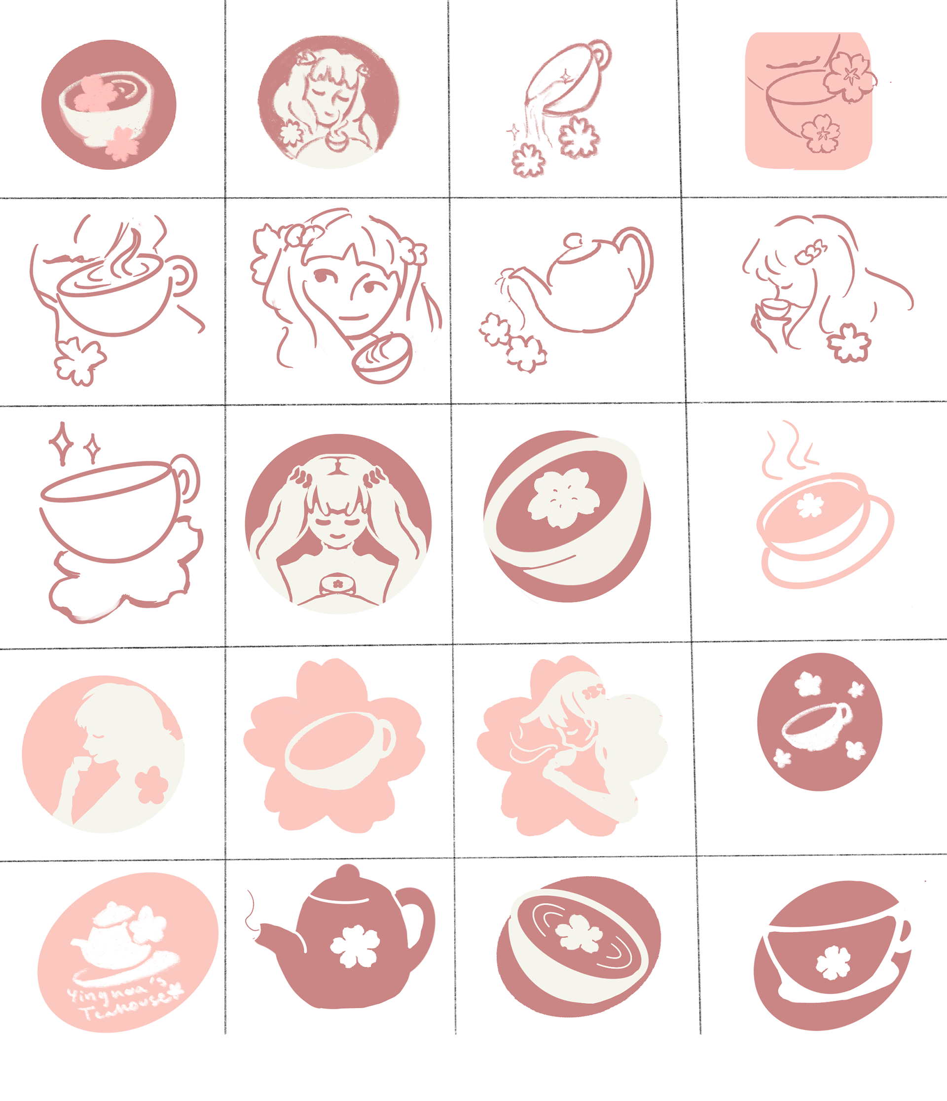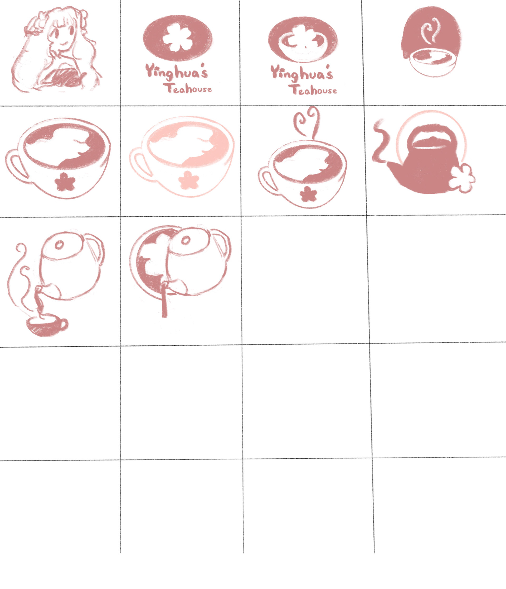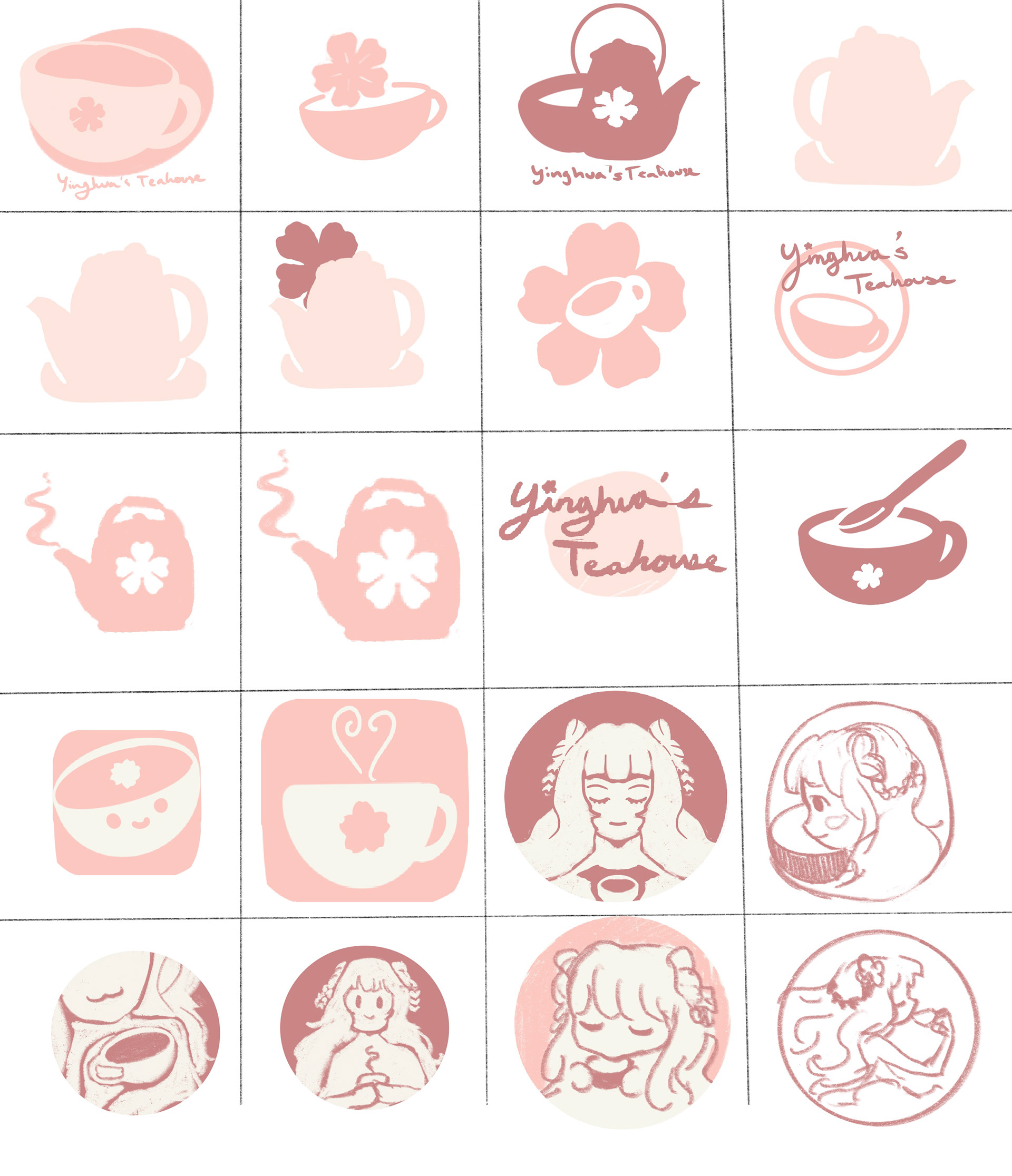 The color palette for the brand was set in stone immediately, and the client's character was a massive inspiration behind the initial sketches of logo concepts. The project started with a conversation behind leading ideas, Yinghua's Teahouse specialized in teas, coffees, and pastries. The focus was on the sweet and cute aesthetic behind Yinghua as a character. The initial 50 sketches were brought down to three favorites, and from there my client suggested combining two concepts.